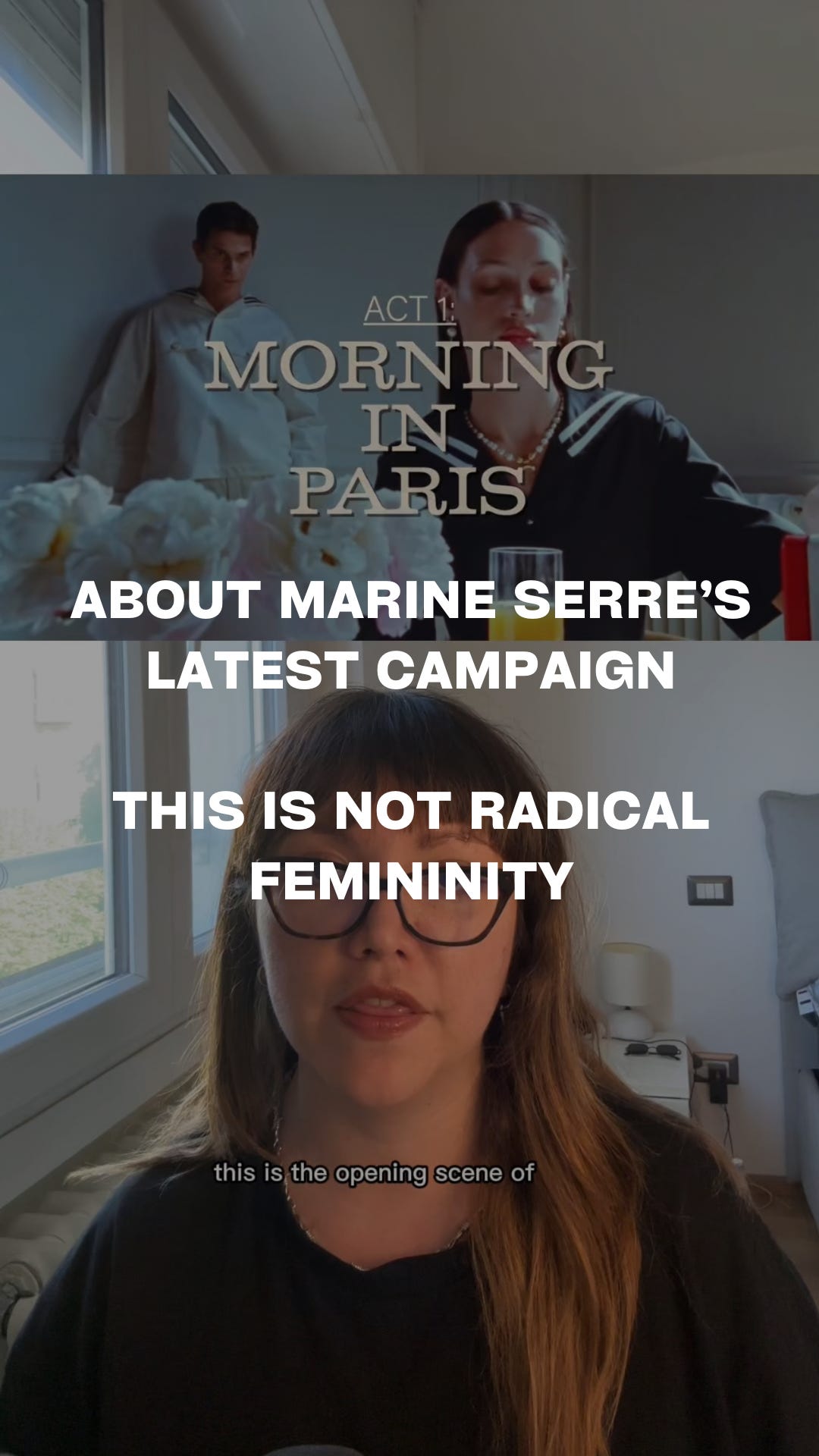 There’s something about a woman sitting in silence while something violent happens around her being romanticized by Marine Serre as if it was a wanna-be Pedro Almodóvar film that doesn’t sit well within the context. Her strength, supposedly, is in her calm. Her composure. Her lack of emotional response. This type of image isn’t new. It plays into a long-standing visual trope where femininity is reduced to a kind of “curated stillness”.