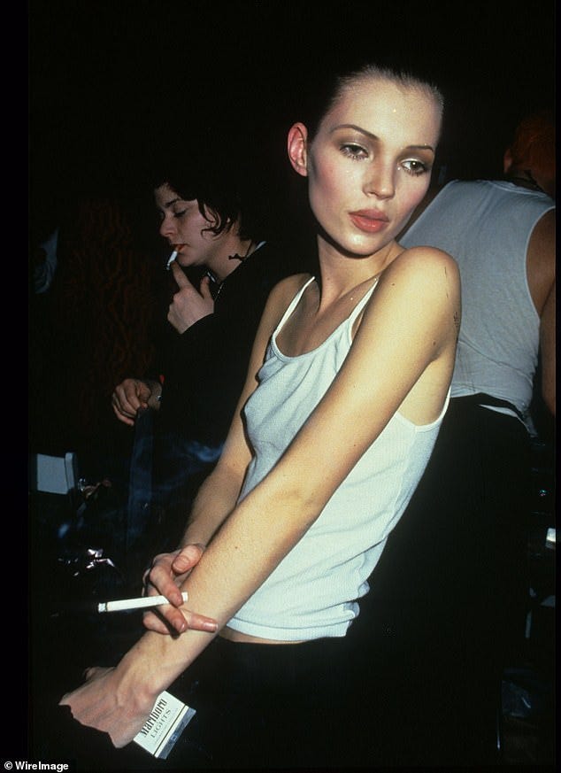 The industry’s obsession with thinness reflects deeper psychological associations that have been built into the visual language of fashion for decades. A thin body, especially when elongated and styled in minimalist silhouettes, is often coded as aspirational. Not necessarily beautiful in a traditional sense, but disciplined. In complete and enviable control. It’s cool, detached, and somehow above the messiness of real life. There’s a reason why the “heroin chic” aesthetic of the late ’90s, that starved herself and smoked uncountable cigarettes a day, has crept back into circulation even after 30-plus years—it’s become less about the actual clothes and more of what the body underneath them is allowed to represent.